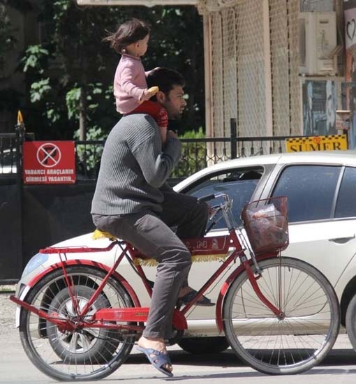ÖLÜME MEYDAN OKUYANLAR! Adana’da hayrete düşüren görüntüler kameraya yansıdı.Baba küçük kızını omuzuna alıp bisiklet sürdü.